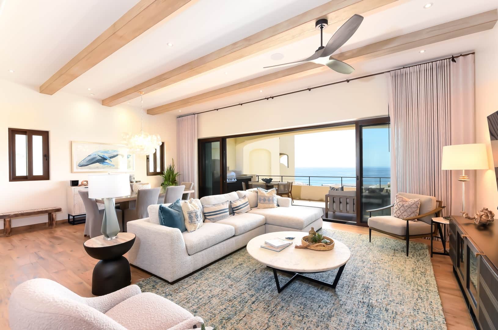 A brand new stylish 3 bedroom 3 bath condo overlooking the Sea of Cortez, nestled in the cliffs of Sierra de la Laguna, and within the exclusive El Encanto de la Laguna coastal development. Large 500 sq.ft. outside terrace for entertaining and grilling, or whale watching from November through February. Private infinity edge pool with sundeck, desert gardens, sauna, fire pit and outside kitchen. Rooms feature 55 to 75" TVs with 7,000 channels, premium movies, series, and US, Canada and other Live TV. Steps away from private access to the stunning beaches with unforgettable sunsets. Your stay includes an exclusive access to the Vera Neo Beach Club Restaurant & Bar Poolside and a private state-of-the-art gym. (Please note this is an Adults Only rental with No Smoking and No Pets.)
